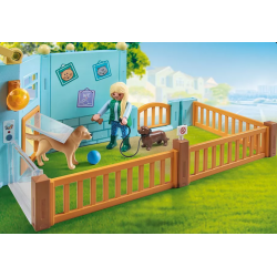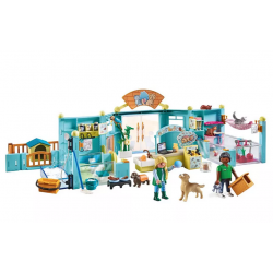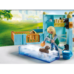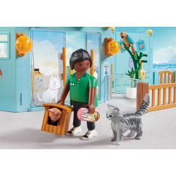 No hotel para animais da PLAYMOBIL, todos os hóspedes recebem cuidados de cinco estrelas. Com áreas dedicadas a cães, gatos e até um papagaio. Os cães desfrutam de acolhedores canis e um lavatório com chuveiro, enquanto os gatos se deitam nas redes ou perseguem brinquedos. Personaliza os comedouros com as etiquetas de nome incluídas e decora o hotel à tua maneira.