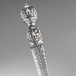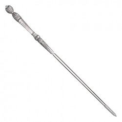 Esta réplica apresenta uma haste em resina transparente, enriquecida com detalhes em relevo e acabamentos em prata antiga, oferecendo um visual sofisticado e fiel ao universo da personagem.